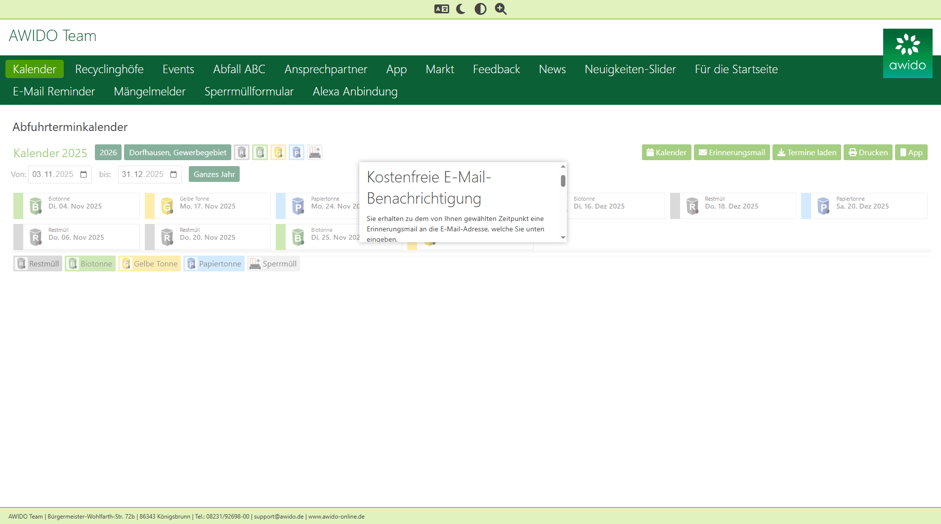 Bei dieser Funktion erhält der Anwender zum gewünschten Zeitpunkt eine E-Mail mit einer Erinnerungsmeldung an den nächsten Termin. Dies wird durch ein kostenfreies E-Mail Abonnement ermöglicht. Das Abonnement kann jederzeit durch einen in der Erinnerungsemail enthaltenen Link abbestellt werden.