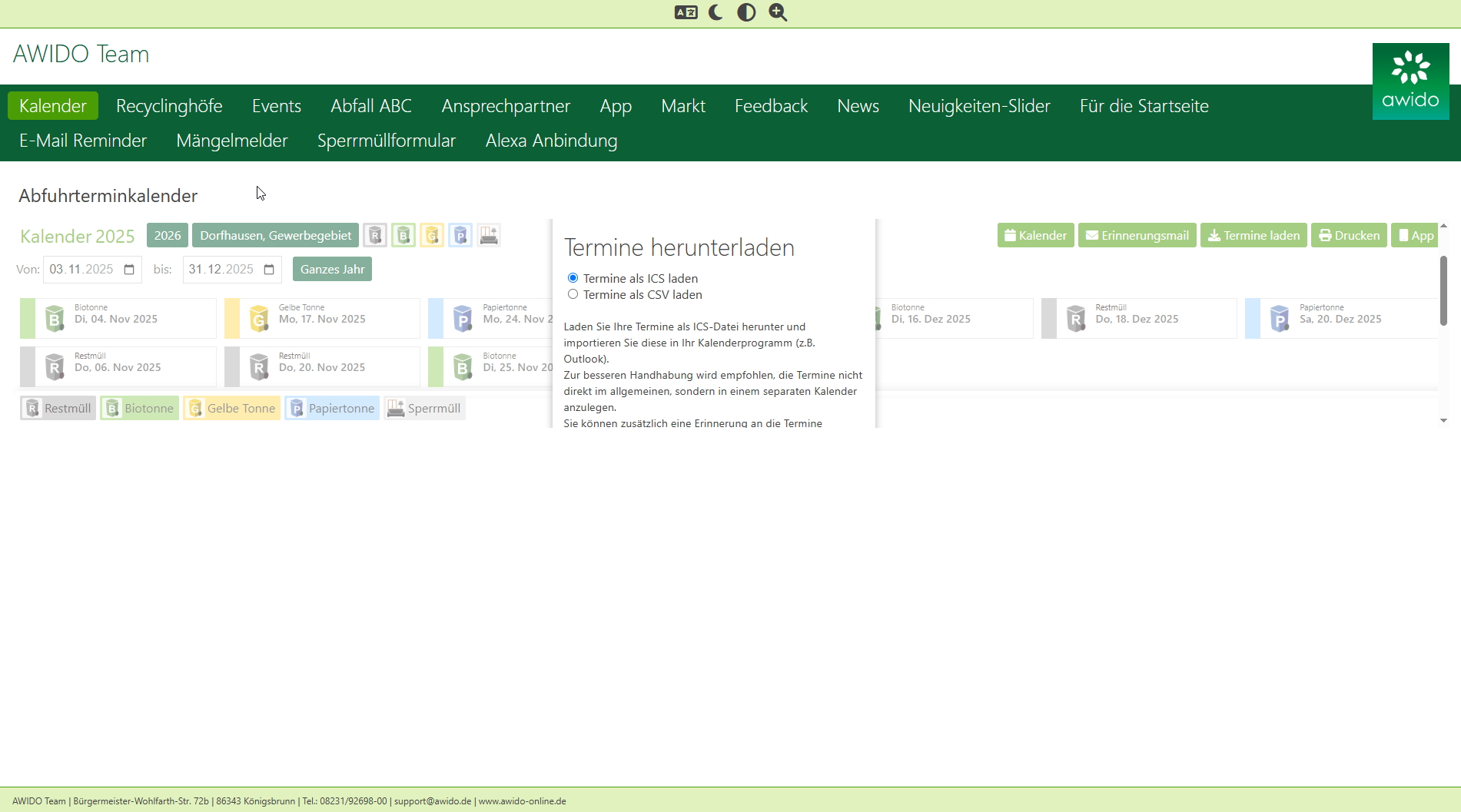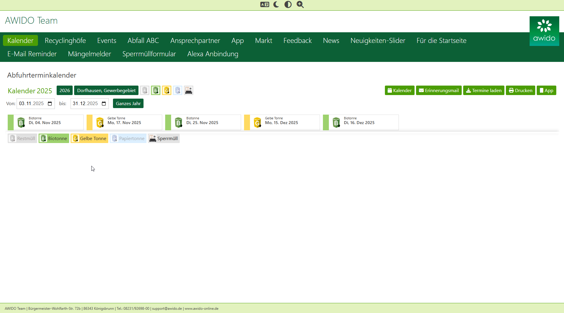 Alle gewünschten Abfuhrtermine werden direkt im Web-Browser angezeigt, wodurch das Herunterladen eines PDF-Kalenders hinfällig wird. Diese Funktion ist wie gemacht für die Benutzer, die nur auf die Schnelle die nächsten Abfuhrtermine im Internet ansehen wollen.
