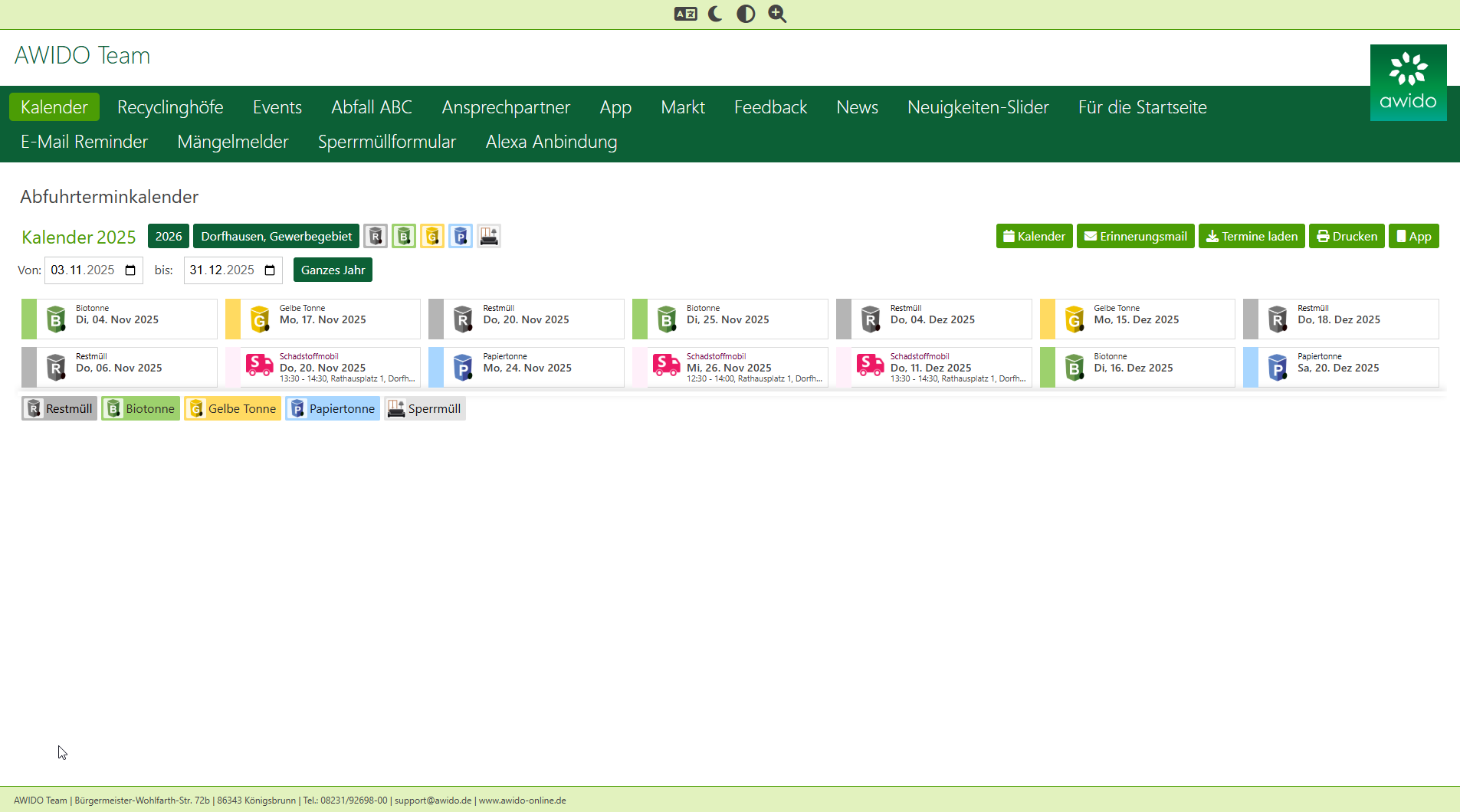 Für eine schnelle Übersicht der nächsten anfallenden Abfuhr- oder Sondertermine bietet der interaktive Kalender die Möglichkeit auf die sogenannte Listenansicht umzuschalten. Hierbei werden alle Termine mit Namen und genauem Datum aufgelistet.