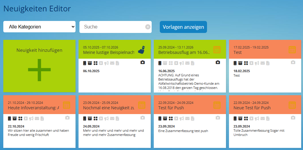 Für die Neuanlage einer Nachricht wählen Sie die grüne Schaltfläche "Neuigkeit hinzufügen".