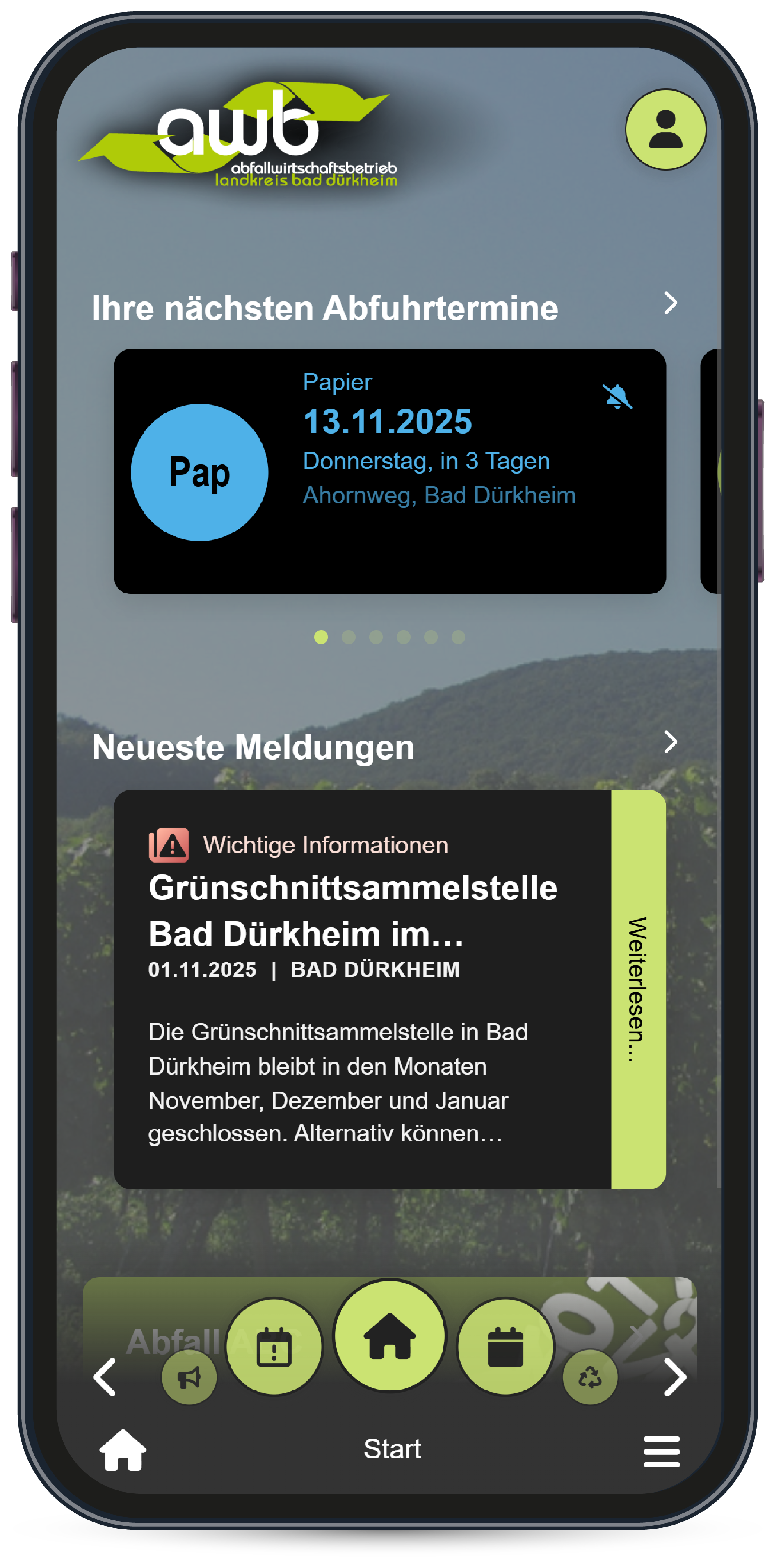 Ab September 2016 gibt es für die Bürger des Abfallwirtschaftsbetrieb Landkreis Bad Dürkheim alle Informationen bzgl. der Abfallentsorgung in einer Anwendung. Hier können sie den eigenen Abfuhrplan als PDF ausdrucken, sich per E-Mail oder mit der App per Push-Benachrichtigung an die Abfuhr erinnern lassen, nachsehen wo der nächste Werstoffhof ist und wann er geöffnet hat.