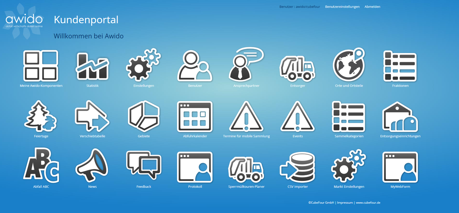 Mit dem Administrations-Paket kann der Kunde seine Daten im AWIDO-Kundenportal selbst pflegen. Mit dem Kauf des Administrations-Pakets wird das AWIDO Kundenportal um zahlreiche Editoren erweitert. Der Kunde kann im Portal beliebige Benutzer einrichten und pro Anwender festlegen, welche Daten dieser bearbeiten und sehen darf. Damit können vor allem Subunternehmer ihre Abfuhrtermine selbst eingeben, wodurch Aufwand und Fehler reduziert werden.