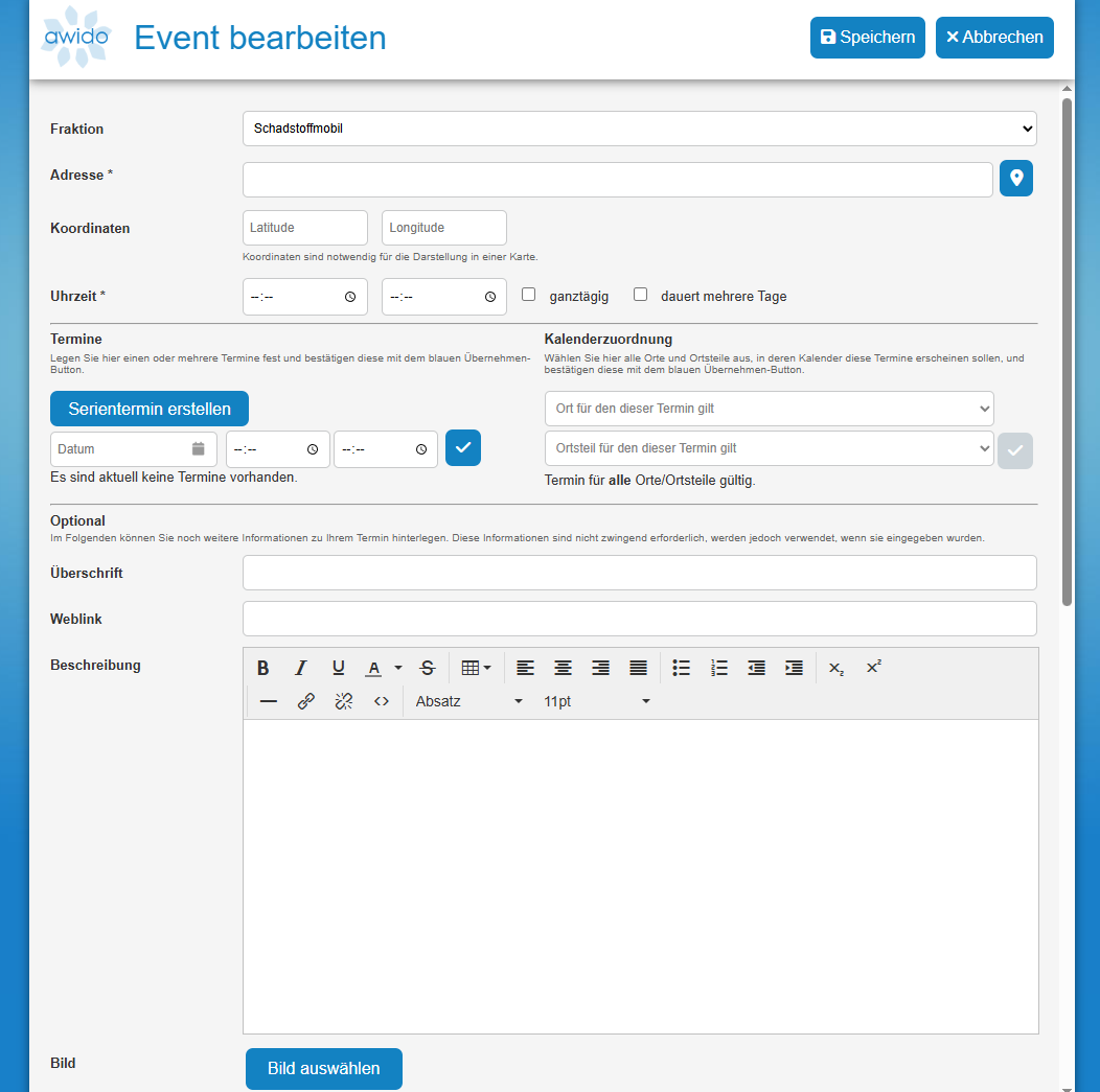 Neben Adresse und Uhrzeit können Sie optional die Koordinaten für eine Kartenansicht, sowie eine Überschrift, einen Weblink und eine Beschreibung zu hrer Veranstaltung eintragen. Ein Bild kann ebenso hizugefügt werden.