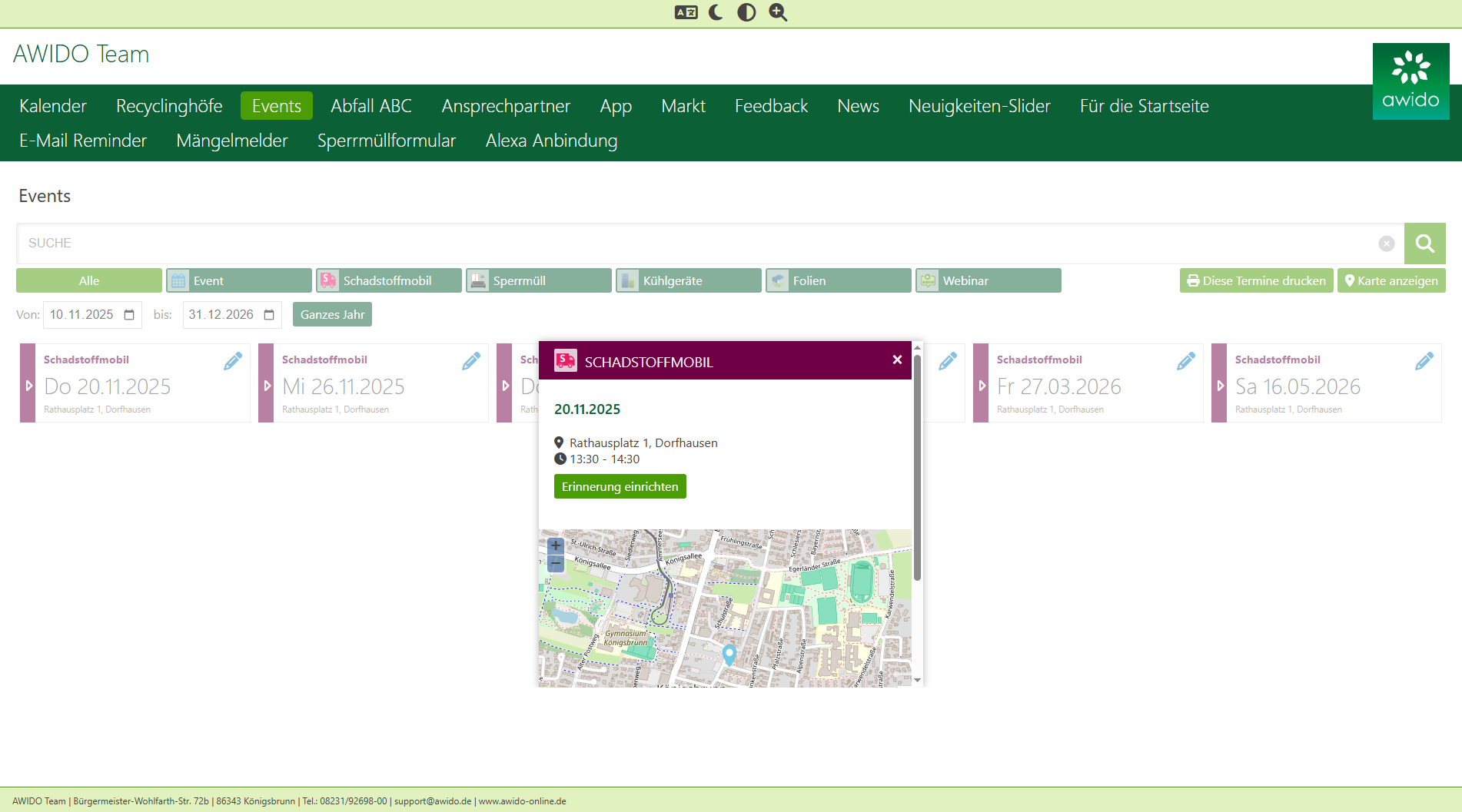 Durch Eingabe eines gewünschten Ortes oder eines anderen Suchbegriffs im Suchfeld, findet der Anwender schnell die entsprechenden Termine. Klickt er einen Eintrag an, erscheinen weitere Informationen, wie z.B. ein Beschreibungstext und eine Karte, auf der der genaue Standort verzeichnet ist.