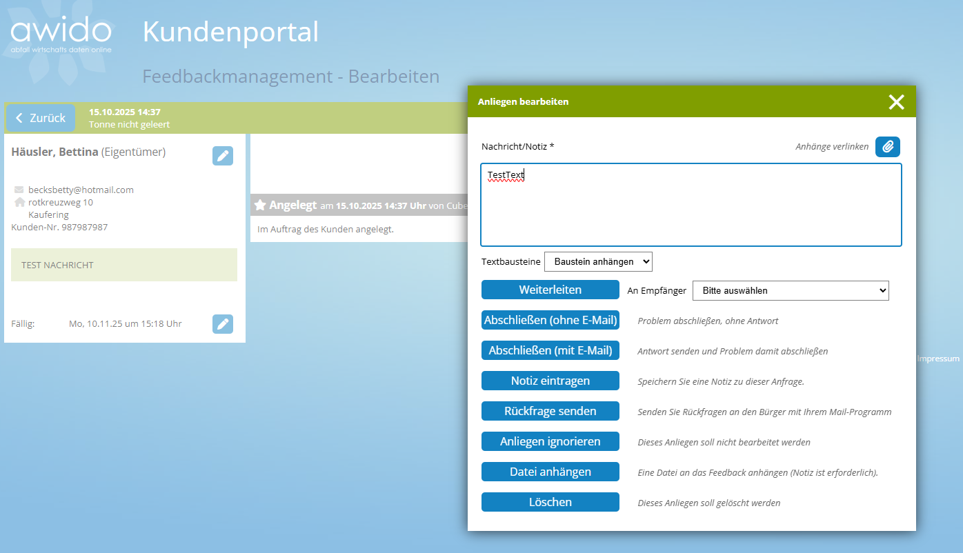 - ein Feedback an einen Kollegen oder auch an ein Abfuhrunternehmen weiterzuleiten