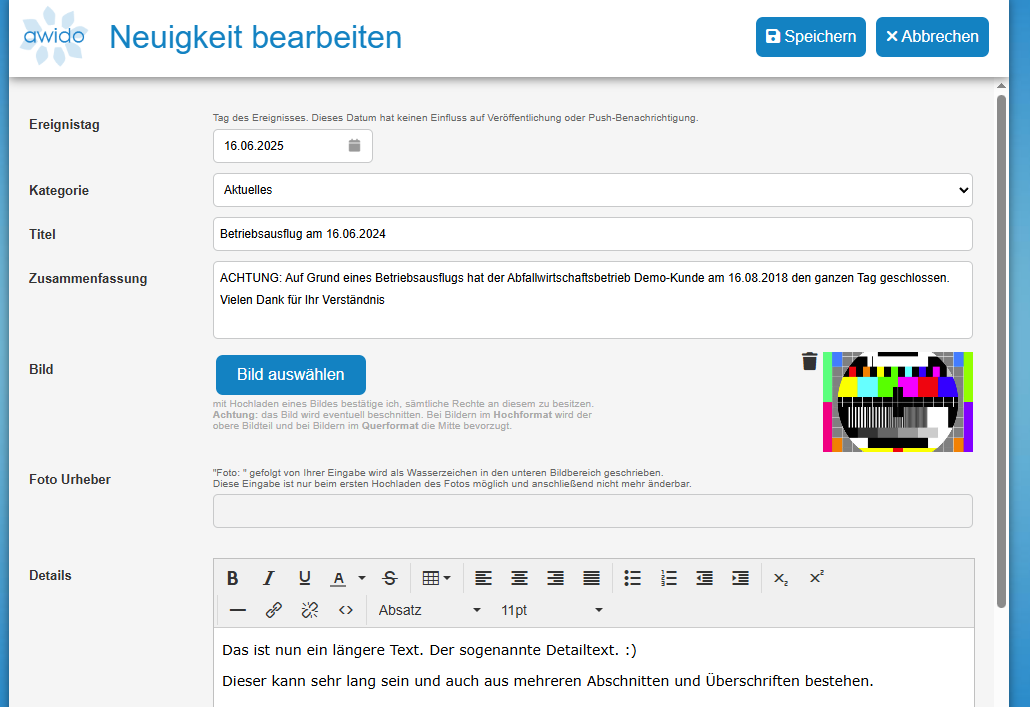 Neben dem Titel können Sie auch eine Kurzfassung (Teaser) Ihrer Nachricht eintragen. Diese Daten werden auf der Startseite der AWIDO-App angezeigt.